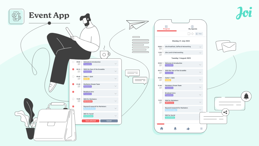Additionally, Joi simplifies the management of event assets, ensuring you have everything you need for a successful event. The onsite schedule builder takes your event planning to the professional league, ensuring every participant knows where to be and what to do on the day.